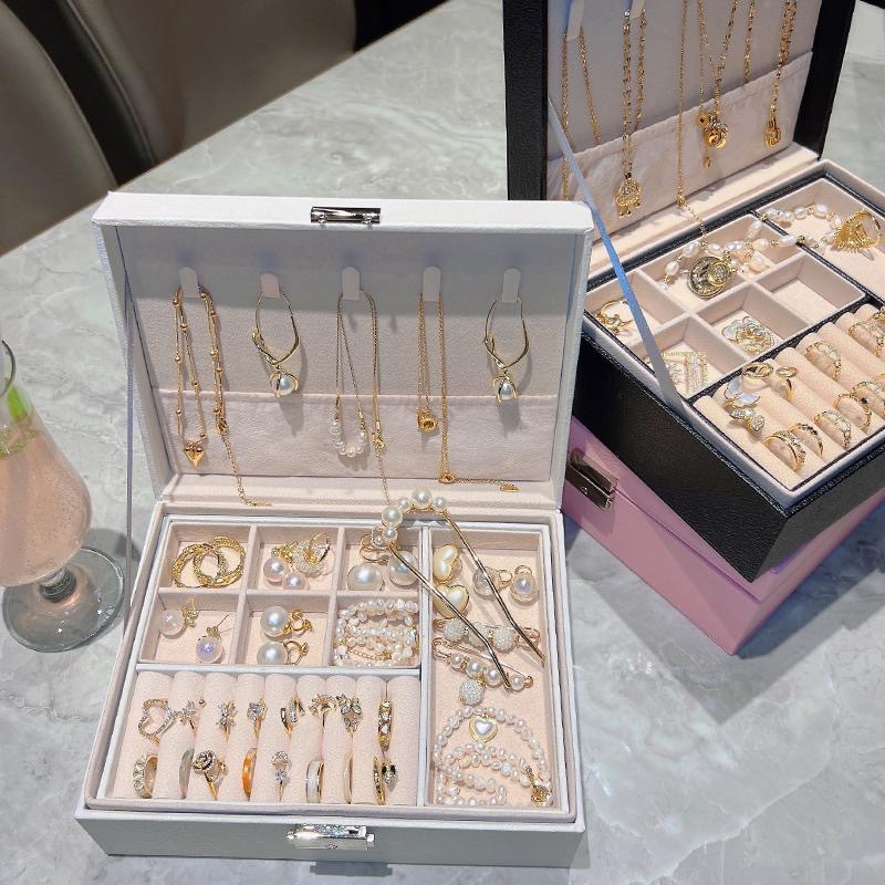 大切なアクセサリーを美しく整理できるレザー製のジュエリーボックスです。