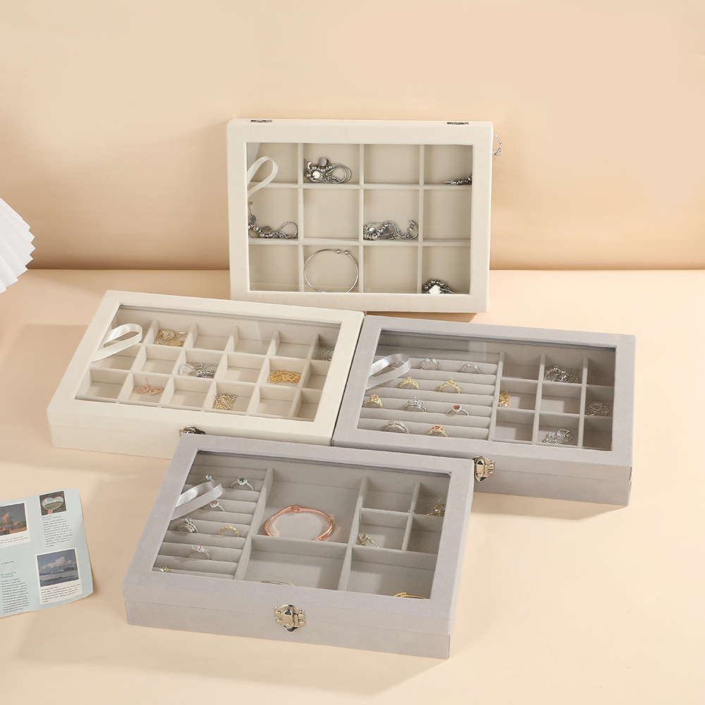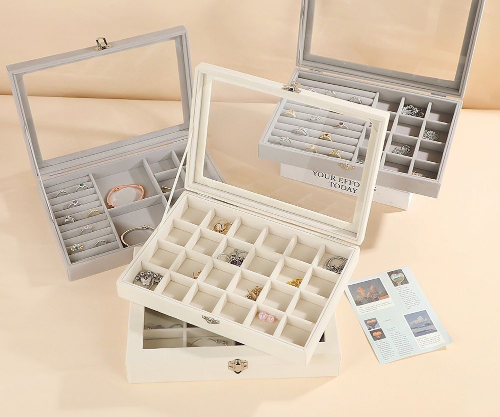 透明な蓋で中身が一目で確認でき、引き出し式の多段構造で指輪やネックレス、ブレスレットなどを種類別に分けて収納できます。