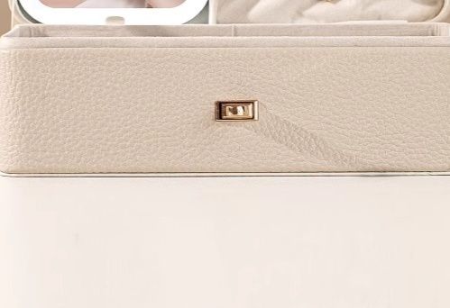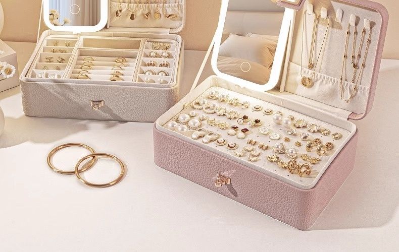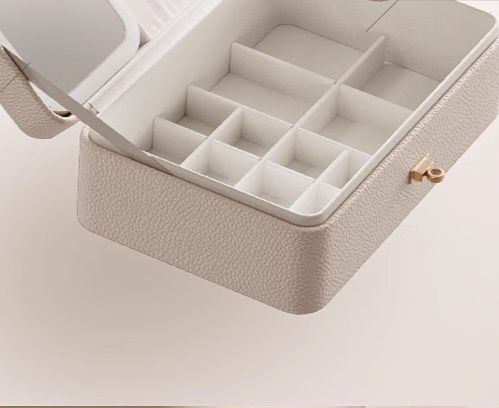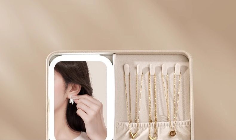 蓋には明るい照明付きミラーを搭載し、メイクやアクセサリー選びに便利な仕様となっています。