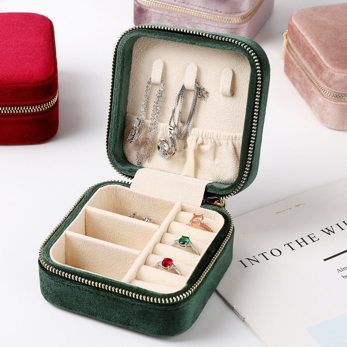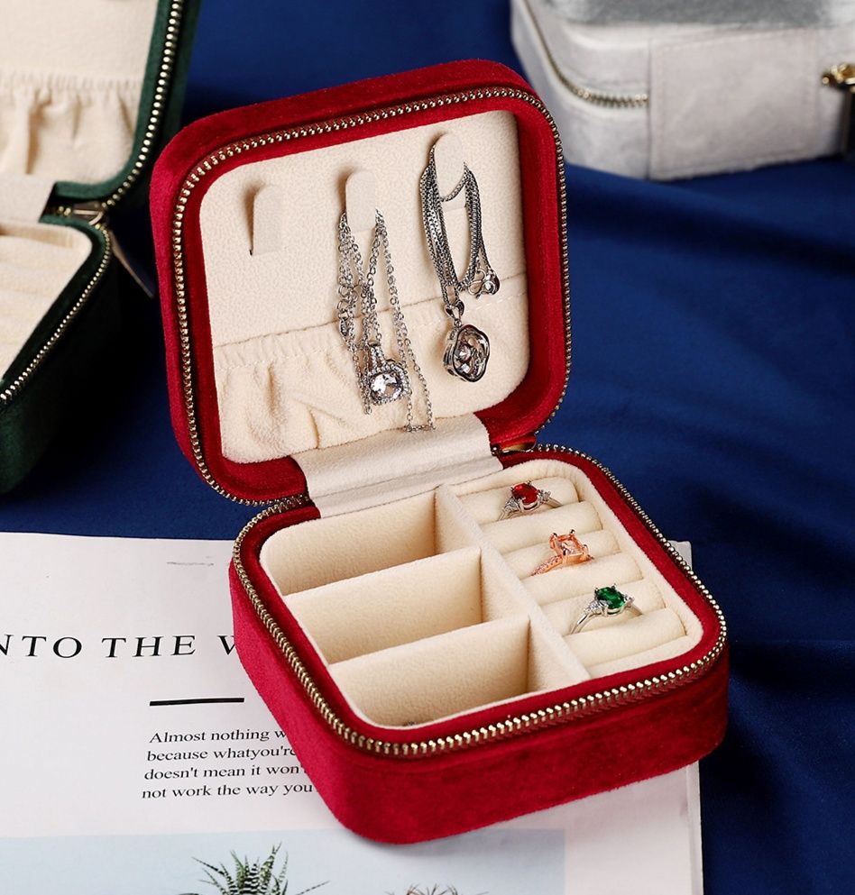 内部は仕切りとリングホルダーを備え、指輪やネックレスを分けて収納できます。