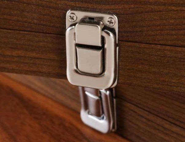 透明な窓が付いた蓋で中身を一目で確認でき、金属製の留め具でしっかりと閉じることができます。