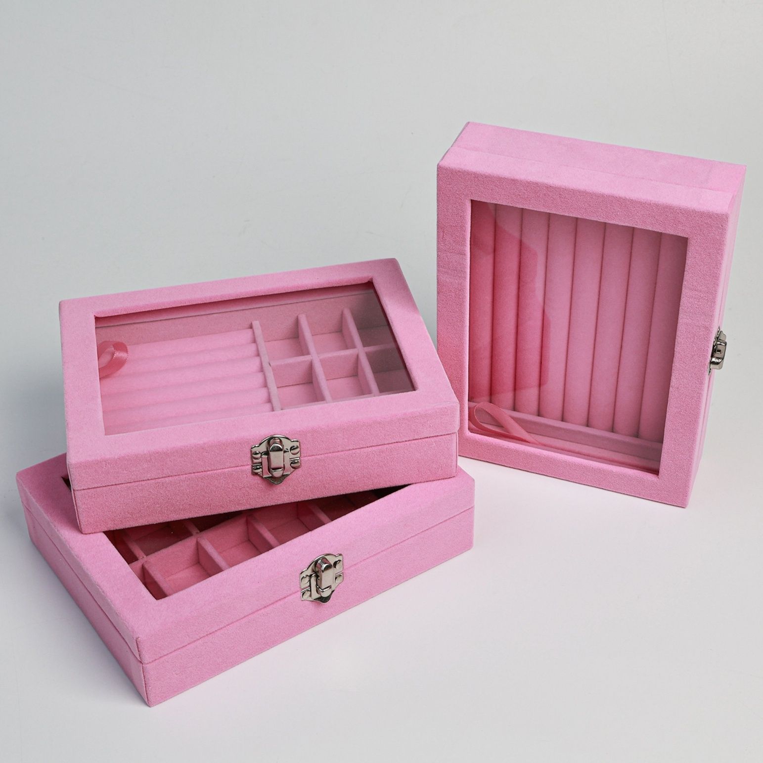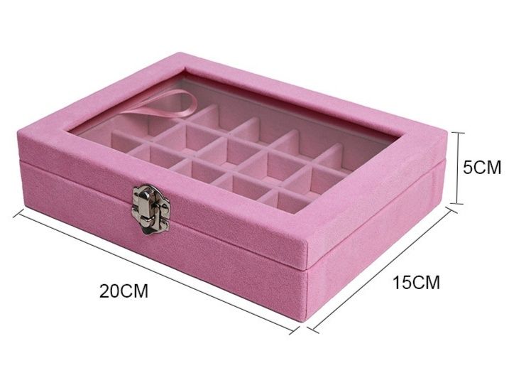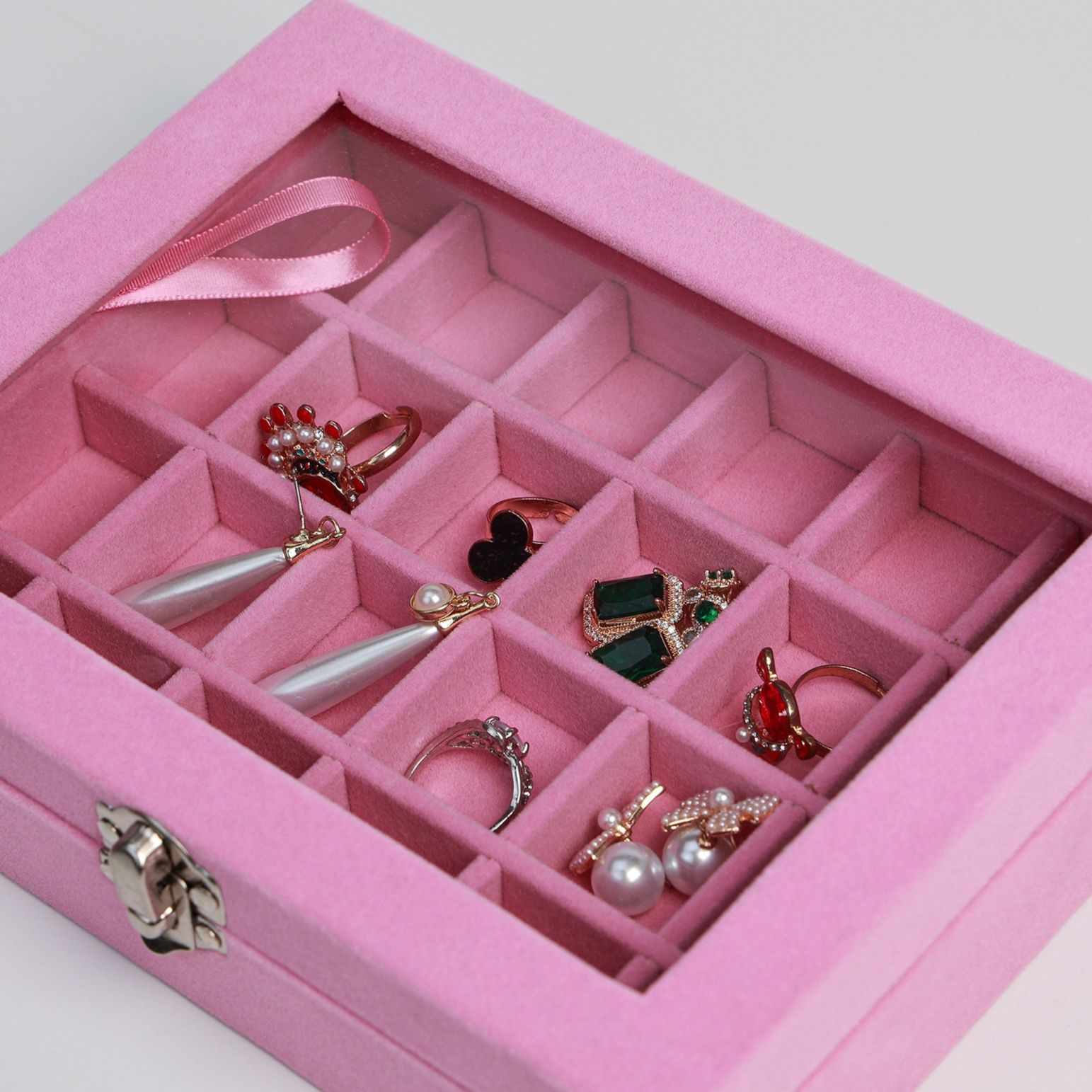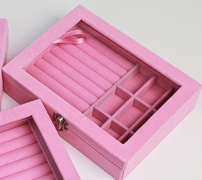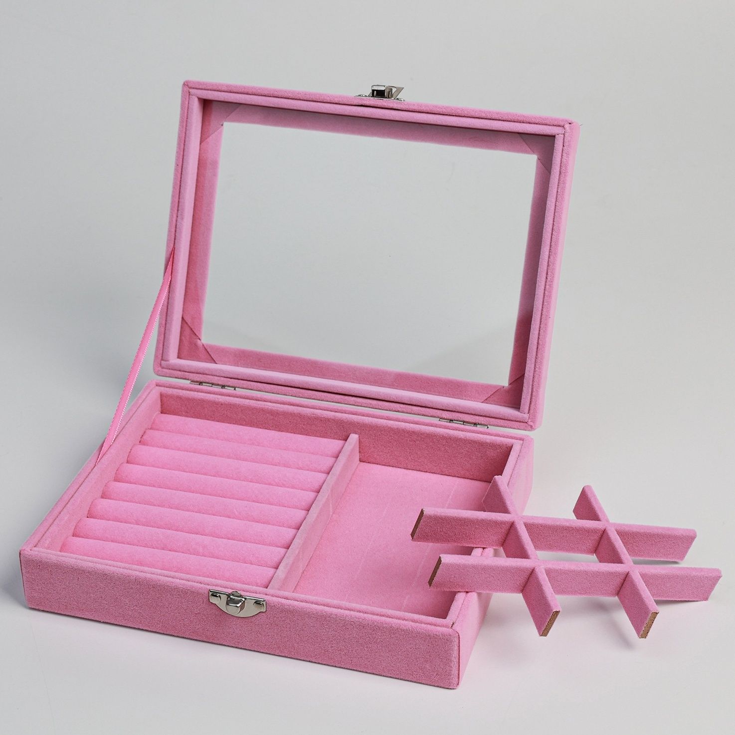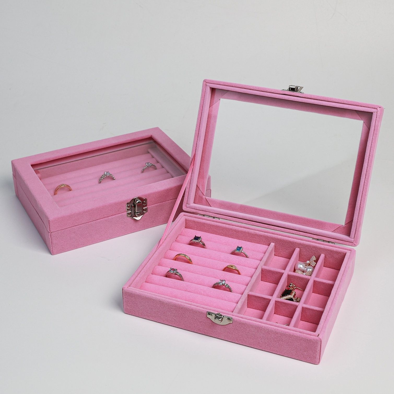 透明な窓から中身が一目で確認でき、細かな仕切りでイヤリングやリング、ネックレスなどを種類別に分けて収納できます。
