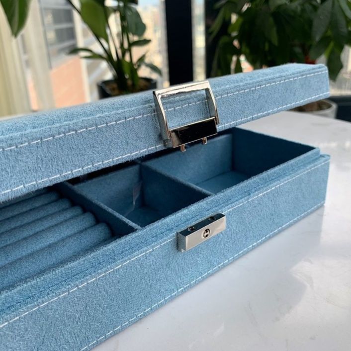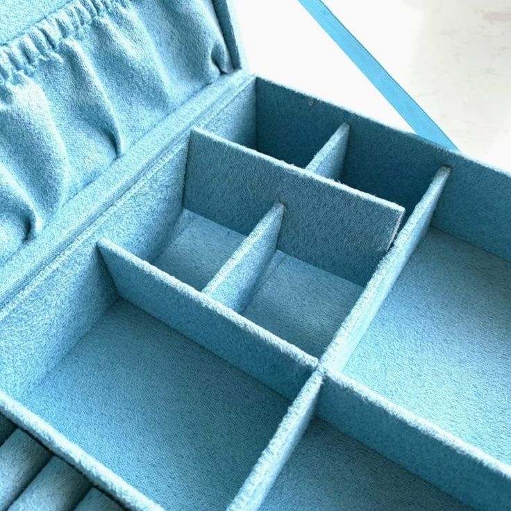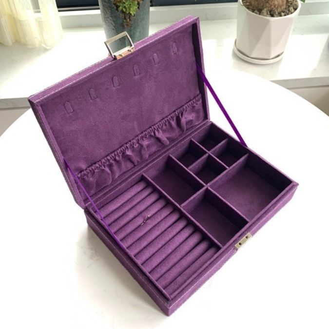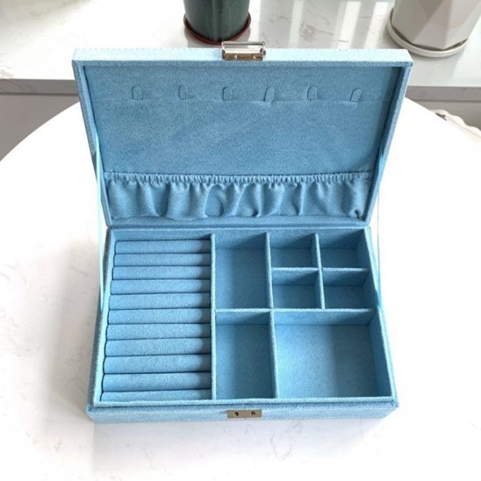 内部には指輪を差し込めるリング溝や、ピアス・ネックレスを整理できる取り外し可能な仕切り付きの収納スペースを配置。大切なアクセサリーを種類別に美しく整理できます。